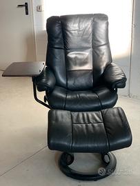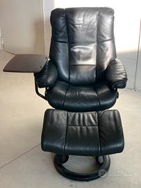 In Ottimo Stato Poltrona Stressless modello Mayfair con base Classic rivestita in Pelle Nera completa di Pouff e tavolino. Oggi Nuova costa euro 3.440,00