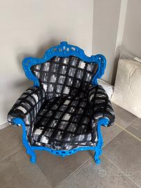Bellissima e unico esemplare, perchè realizzata in legno e stoffa da artigiano, di una poltrona in stile Queen of Love. Rivestimento rappresentante delle chitarre. Tinta grigia e blu. Senza difetti. Ben imbottita.