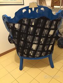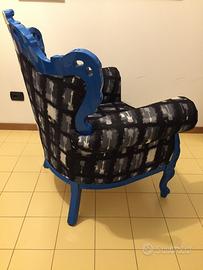 Bellissima e unico esemplare, perchè realizzata in legno e stoffa da artigiano, di una poltrona in stile Queen of Love. Rivestimento rappresentante delle chitarre. Tinta blu. Senza difetti. Imbottita e comoda. Ideale per grandi salotti, negozi, vetrine, esposizioni, discoteche, hotel.