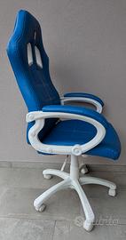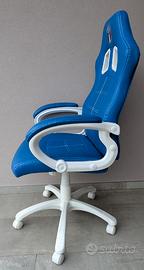 Causo inutilizzo, vendo poltrona da ufficio, stile gaming, colore azzurro, con logo ITALIA (4 volte Campione del Mondo) ricamato sullo schienale (fronte e retro). Altri particolari: