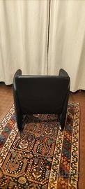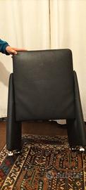 Poltrona di design in pelle nera con robusto telaio in legno, quattro ruote piroettanti. Ottimo stato.