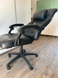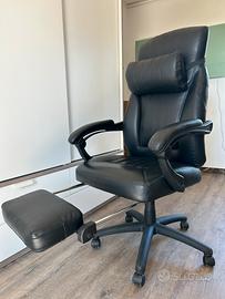Poltrona presidenziale in similpelle nera, altezza regolabile, schienale reclinabile, poggiatesta regolabile e removibile, poggiapiedi estraibile da sotto la seduta.