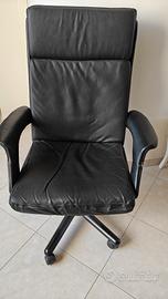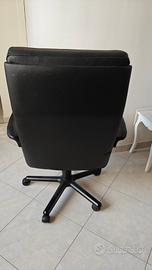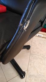 Poltrona ufficio girevole in pelle nera, regolabile in altezza e basculante. Discrete condizioni con una lacerazioni in corrispondenza dei braccioli come da foto