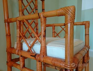 poltrona vintage anni 70 in bamboo e vimini, intreccio geometrico. con cuscino come nuovo. produzione italiana 1970 Altezza 90 cm Larghezza 50cm cm Profondità 50 cm Altezza seduta cm