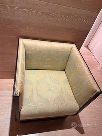 Seduta e schienali imbottiti, rivestiti in tessuto decorato con motivi stilizzati.