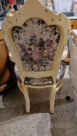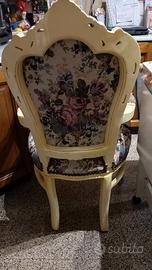 Vendo elegante poltrona vintage in stile classico, con struttura in legno dipinta in crema chiaro e dettagli intagliati a mano. Lo schienale alto e i braccioli imbottiti offrono comfort e stile, mentre il rivestimento floreale dai toni rosa, viola e verde dona un tocco romantico e raffinato.