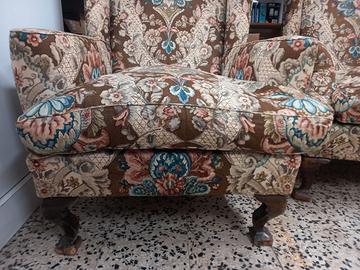 Usate, ma tenute perfettamente. Stoffa originale, perfettamente integra, idem la struttura e le parti in legno. Si compongono di un cuscino che si adatta perfettamente alla seduta. Le due sedie sono leggermente diverse, utilizzate per ospiti maschili (con poggia braccia piatti, quella di sinistra nella prima foto) o femminili (poggia braccia curvi, quella di destra nella prima foto).