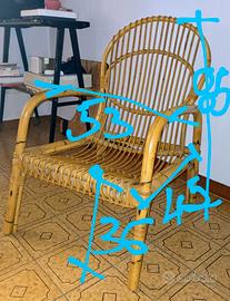 Poltrona vintage di vimini (più comunemente bambù) Anni 40, molto ben tenuta, integra Dimensioni in foto Altezza seduta 36cm profondità 45 larghezza totale 53 NON disponibile alla spedizione Ritiro a carico acquirente