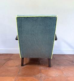 Iconica poltrona in legno piegato disegnata da Jindrich Halabala originale degli anni trenta, in stile art deco. La tappezzeria è nuova, struttura originale. Il tessuto è in morbido velluto con motivo classico a lisca di pesce bianco e verde con in contrasto cordino in tricotino di lana giallo neon.