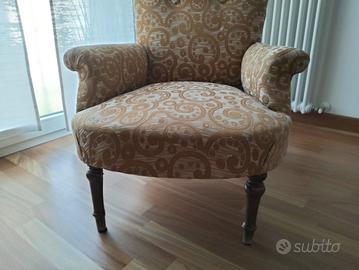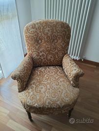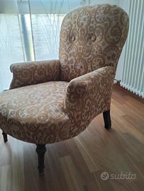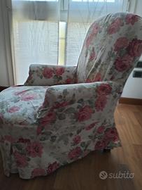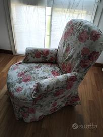 poltrona imbottita reversibile. la poltrona è con tessuto damascato di colore beige/ocra poi c'è in più una fodera fiorata sul rosso/rosa . le misure sono altezza 90 altezza seduta 40, larghezza 65, profondità 72. ritiro in loco