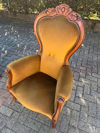Vendesi splendida poltrona classica in stile Luigi Filippo, caratterizzata da un elegante fusto in legno massello finemente intagliato a mano. Il pezzo presenta una cimasa (fregio superiore) decorata con motivi floreali che ne esalta il carattere raffinato.