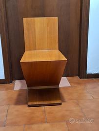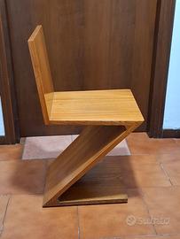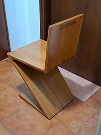 La sedia Zig Zag è famosa per la sua *forma a zig zag* che sfida le convenzioni della progettazione tradizionale di mobili, con una struttura che *sostiene il corpo senza necessitare di quattro gambe*.
