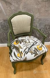 La seduta è stata interamente ricostruita e rivestita con un tessuto di alta qualità a fantasia botanica, con motivi di foglie e agrumi nei toni del giallo e del verde. Lo schienale, imbottito nuovo, è rifinito con un tessuto chiaro a trama naturale, perfetto per dare luminosità e contrasto.