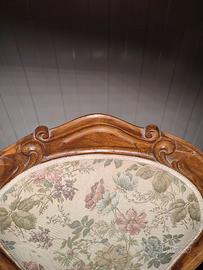 Rivestimento: Seduta e schienale sono imbottiti e rivestiti con un tessuto broccato a motivi floreali. Il tessuto è in buone condizioni generali, con solo lievi segni di usura coerenti con l'età.