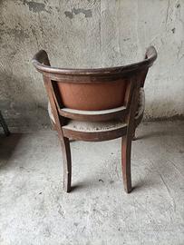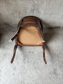 poltroncina in legno massiccio imbottita con copertura in similpelle alta 65 cm larghezza 53 profondità 43 altezza seduta 45 presenta dei decori sulle gambe .Da eseguire trattamento antitarlo.
