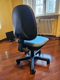 Poltroncina da scrivania regolabile con rotelle; seduta e spalliera in tessuto azzurro.
