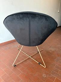 Poltroncina dal design moderno, rivestita in morbido velluto nero. La struttura è solida con base in metallo color oro/rame, presenta lievi segni di usura, come da foto. Incluso cuscino coordinato in velluto, con stampa ananas dorata, completamente sfoderabile grazie alla pratica zip nascosta (anche la seduta è sfoderabile). Consegna a mano
