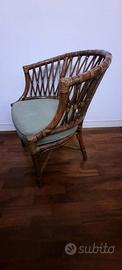 Splendida poltroncina in legno con legature in quoio. Produzione italiana per Mc Guire Company San Francisco. Seduta imbottita color verde. Etichetta applicata sotto la sedia In buone condizioni. Spese per eventuale spedizione da definire