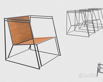 Poltroncina minimalista di design in acciaio al carbonio 60x60x60, seduta e schienale in multistrato di pioppo (cuscineria esclusa). Realizzata artigianalmente e saldata a mano. Finitura e Stile: La particolarità di questi pezzi sarà l'aspetto materico e autentico: Colore: Ferro grezzo naturale. Dettagli: Smerigliatura sui punti di saldatura per enfatizzare la lavorazione manuale. Protezione:Trattamento finale con vernice trasparente protettiva per preservare il metallo ed evitare l'ossidazione nel tempo. Seduta e schienale realizzati con pannelli in legno con trattamento impregnante. -Personalizzazione su richiesta (vernice, cuscineria) -Possibilità di realizzare un divanetto due posti con lo stesso stile.