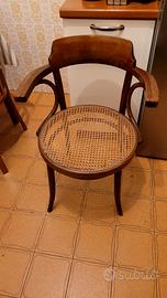 Splendida poltroncina inlegno curvato di faggio e seduta in paglia di Vienna, in stileMichael Thonet. Si tratta delModello n. 233, un pezzo iconico spesso utilizzato come sedia da ufficio o da caffè grazie ai suoi ampi braccioli avvolgenti .