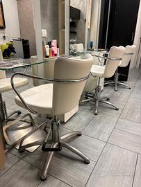 Poltroncina parrucchiere professionale – design moderno Vendo poltroncina da parrucchiere in ottime condizioni, ideale per saloni professionali o postazioni styling. Seduta comoda ed elegante, rivestita in similpelle color chiaro, facile da pulire e resistente all’usura. Struttura solida con base girevole in metallo a 5 razze, dotata di pompa idraulica per la regolazione dell’altezza e poggiapiedi integrato. Braccioli cromati dal design moderno che garantiscono comfort e stile. Perfetta per chi vuole arredare il proprio salone con un prodotto funzionale e curato. Caratteristiche: * Seduta girevole * Altezza regolabile (pompa idraulica) * Rivestimento in similpelle * Braccioli cromati * Base stabile a 5 razze * Buono stato generale Disponibile per visione. Ritiro a carico dell’acquirente.