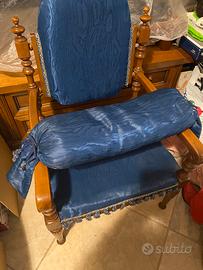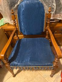 Vendo poltrona da camera in legno di noce con tappezzeria blu. Conservata in perfetto stato Non tarlata