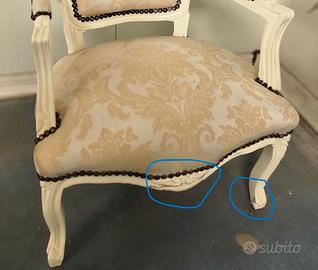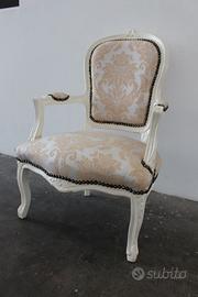 Vendo elegante poltroncina in stile Luigi XV, ideale per amanti del restauro o per arredamento in stile Shabby Chic / Provenzale. Legno laccato bianco con fregi intagliati. Tessuto: Damascato con motivi floreali nei toni dell'oro/beige La poltrona necessita di alcuni interventi di ripristino. Ritiro a Pero (Milano)