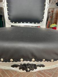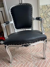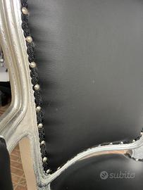 Poltroncina stile barocco in foglia d’argento e rivestita in ecopelle nera.