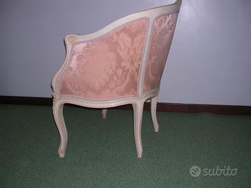 1 Poltroncina delle prime 3 foto, stile Luigi XV in ottimo stato da esposizione, in legno di faggio intagliato a mano, laccata, decorata e imbottita come da foto allegate.