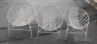 3 poltroncine da esterno anni 60 molto particolari ( guarda la foto della gamba dietro ) . Una stecca della seduta da saldare, da restaurare