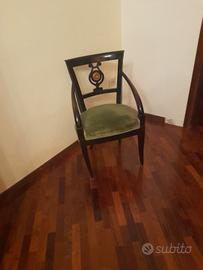 Le sedute presentano una solida struttura in legno ebanizzato/mogano con le tipiche linee curve e i braccioli sagomati. Lo schienale a giorno è impreziosito da un intarsio/dipinto centrale (descrivere il soggetto: es. lira, uroboro, decoro neoclassico). Il set è attualmente rivestito in un elegante velluto verde. Ottime condizioni strutturali, l'imbottitura e il tessuto potrebbero richiedere un restauro per valorizzarne appieno il potenziale, oppure possono essere mantenute così per un fascino autentico. Ideali per una sala da pranzo o come sedute d'accento in un salotto di prestigio.