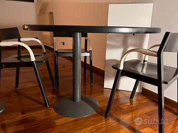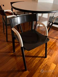 Quattro poltroncine di Design laccate nero e bianco ArcLinea. Una delle quattro poltroncine ha una piccola parte della laccatura consumata, come da foto. Disponibile anche un tavolo rotondo con piano in Duropal, appoggio angolare a parete e piantana in ghisa.