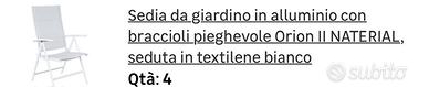4 sedie con braccioli bianche in alluminio da terrazzo/giardino. Nuove, imbustate. Acquistate da Le RoiMerlin e mai usate per cambio progetto terrazzo. pagate 220euro, vendo a 150. Ritiro in zona Piazza Frattini.