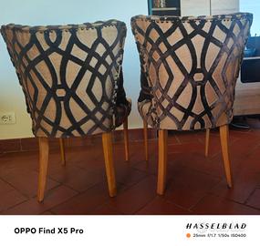 Bellissime poltroncine in tessuto con stampa geometrica in ottimo stato, tenute benissimo ed praticamente mai usate (solo per arredamento). Cuscini tono su tono dello stesso tessuto in dotazione. Seduta comoda. Acquistate al prezzo di 310 euro l'una in un negozio di riuso e restauro a Roma (Scenography). Possono essere vendute anche separatamente.