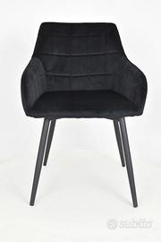 Poltroncina nuova imbottita e rivestita in velluto disponibile in due varianti di colore (grigio scuro, nero) con gambe in acciaio verniciato nero opaco e piedini piatti.