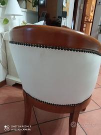 Due poltroncine in ottimo e robusto legno, copertura in pelle chiara splendidamente tenute no graffi no macchie ,altezza seduta cm45 per cambio arredamento molto robuste e comode di buon aspetto estetico.