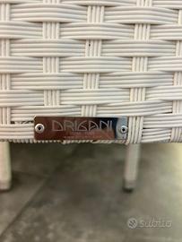 50 sedie di design per esterno con braccioli realizzate con base e telaio in alluminio verniciato a polvere, intreccio in fibra di polietilene (polyrattan) ad alta densità.
