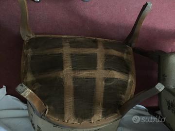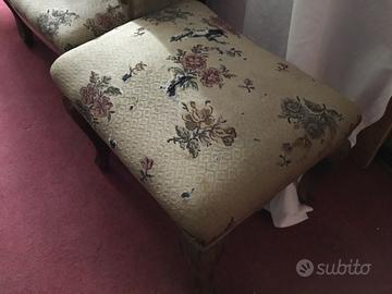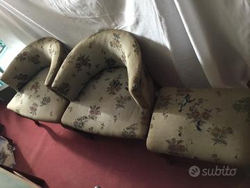 Poltroncine vintage da camera da letto. Sono due poltroncine è un poggiapiedi, struttura in legno con fodere in tessuto. Strutturalmente a posto, necessiterebbero di rifoderatura.