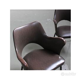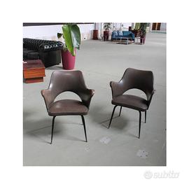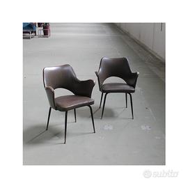 Coppia di poltroncine vintage anni 1950-60, con seduta avvolgente rivestita in ecopelle marrone e struttura in metallo verniciato nero. Dalle linee eleganti e confortevoli, uniscono stile mid-century, solidità e carattere, perfette per arricchire salotti, studi o ambienti contract con un tocco autentico. Dimensioni: Larghezza 61 cm Profondità 57 cm Altezza 74 cm Altezza Seduta 44 cm