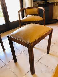 Poltroncine in legno con rivestimento in senape prima meta' del Novecento. Panchetto da toeletta abbinato alle due poltroncine