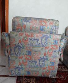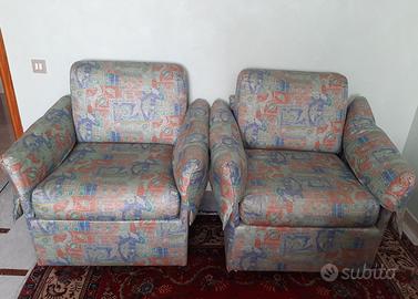 Coppia di poltrone con rivestimento in stoffa di colore verde in fantasia, molto comode, anni 80, usate ma in condizioni più che buone. Misure: altezza complessiva cm. 92, profondità cm. 78, larghezza cm. 90, seduta ampia cm. 55 x 55.
