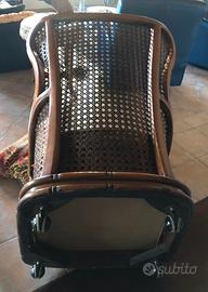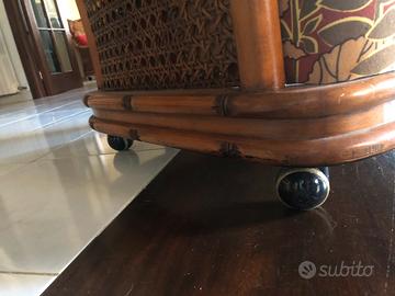Materiali: La struttura è realizzata in finto bambù (faggio lavorato per imitarne le sembianze) con inserti laterali in paglia di Vienna o vimini. Il tessuto originale presenta tipicamente un motivo floreale e tropicale dai toni caldi come il rosso, il verde oliva dotata di una base girevole o di rotelle a scomparsa per facilitarne lo spostamento.