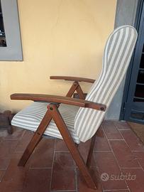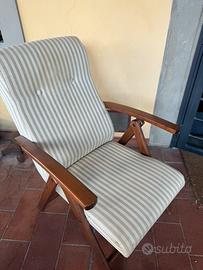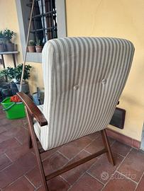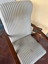 Vendo una coppia di poltrone IKEA in legno con seduta e schienale imbottiti in tessuto a righe beige e grigio. Sono comode, robuste e dallo stile semplice ed elegante.