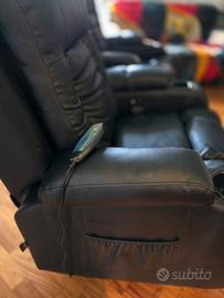 Poltrone in pelle nera,tasche laterali, con telecomando per riscaldare e massaggiare, girevoli e dondolo , con poggia piedi allungabile...comprate un anno fa come nuove vendo per trasferimento città, €300 entrambe, ritiro a domicilio Bagheria