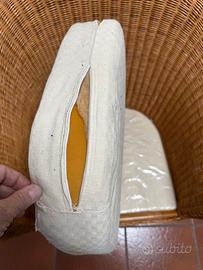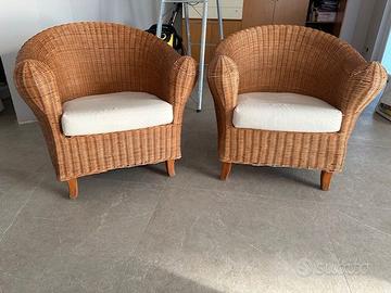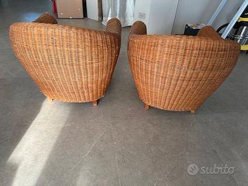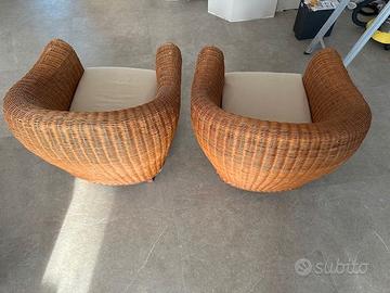 Vendesi causa trasloco una coppia di poltrone in vimini, con cuscini e seduta con molle. in alcuni punti il midollino si è consumato, soprattutto nella parte inferiore, ma non pregiudica l'estetica. I cuscini hanno la cerniera lampo rotta. Dimensioni : Altezza 76 cm, Larghezza 80 cm, Profondità 80 cm. Ritiro solo a mano.