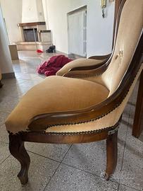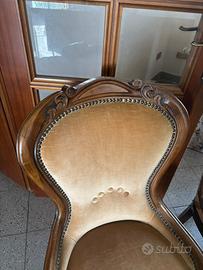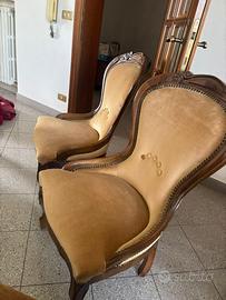 Vendo elegante coppia di poltroncine in stile classico, con struttura in legno massello finemente lavorato e dettagli intagliati sullo schienale. Rivestimento in tessuto color oro/beige con bordatura a borchie, che dona un tocco raffinato e senza tempo. Seduta ampia e comoda, perfette per soggiorno, studio o camera da letto. Le sedie sono solide e strutturalmente in ottime condizioni. Il tessuto presenta segni di utilizzo (visibili in foto), ma può essere facilmente pulito o sostituito per valorizzarle ulteriormente. Dimensioni: Altezza: 100 cm Larghezza: 55 cm Ideali anche per chi ama il restyling o il recupero di mobili vintage. Possibilità di consegna nella provincia di Modena, previo accordo.