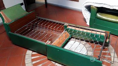 Coppia di poltrone originali fine anni 50,caratterizzate dalla apertura completa per trasformarsi in un letto singolo ciascuna complete di rete . Vengano fornite su richiesta due materasse mai usate in perfetta forma in pura lana cucite a mano come un tempo.