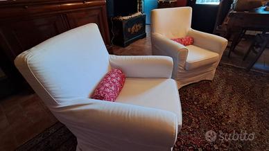Poltrone da salotto. Una perfetta, l'altra ha un piedino da rinforzare. Struttura in legno. Sfoderabili. I cuscini rossi in foto non sono compresi nella vendita. Si vendono preferibilmente in coppia, ma possono essere vendute anche singolarmente. Le misure: profondità seduta cm 56 - larghezza cm 46 profondità totale cm 67 larghezza totale cm 74 altezza seduta da terra cm 42 altezza schienale da terra cm 85 Solo ritiro, no spedizione.