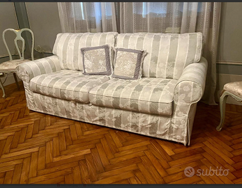 PREGIATO , FUNZIONALE e RAFFINATO divano letto matrimoniale firmato "POLTRONE & SOFA'", in stile COTTAGE/FARMHOUSE realizzato in elegante rivestimento a righe grige e bianco effetto SETA. Il design con braccioli arrotondati, gonna sfiancata e tessuto a righe richiama l'estetica confortevole e accogliente delle case/chalet in montagna. CONDIZIONI: ottimo stato conservativo, praticamente nuovo, adoperato di rado in seconda abitazione, se proprio bisogna essere pignoli SEGNALO piccola macchiolina come da ultima foto. DIMENSIONI: da chiuso L200xp91xh84/90(incluso cuscini) cm da aperto L233x146 materasso:L180x142xh9cm DETTAGLI: Divano letto di grande eleganza e comfort, pensato per accogliere con stile anche gli ospiti dell'ultimo momento. Le linee pulite e raffinate si fondono con materiali di qualità, creando un arredo caldo e sofisticato, perfettamente in armonia con l'estetica di uno chalet di montagna. Compatto e intelligente, è la soluzione ideale per stanze salva-spazio, dove ogni dettagli conta: di giorno divano accogliente, di notte letto comodo e pratico, facile da aprire e pensato per garantire un riposo confortevole. VISIBILE e RITIRABILE zona Treviso.