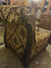 Vendo n.2 Poltrone imbottite con telaio in legno di noce massello e tappezzeria damascata. Lievi segni di usura sulla tappezzeria. Complessivamente in ottime condizioni. Struttura in legno e imbottitura ottimamente conservata. Produzione anni '70.